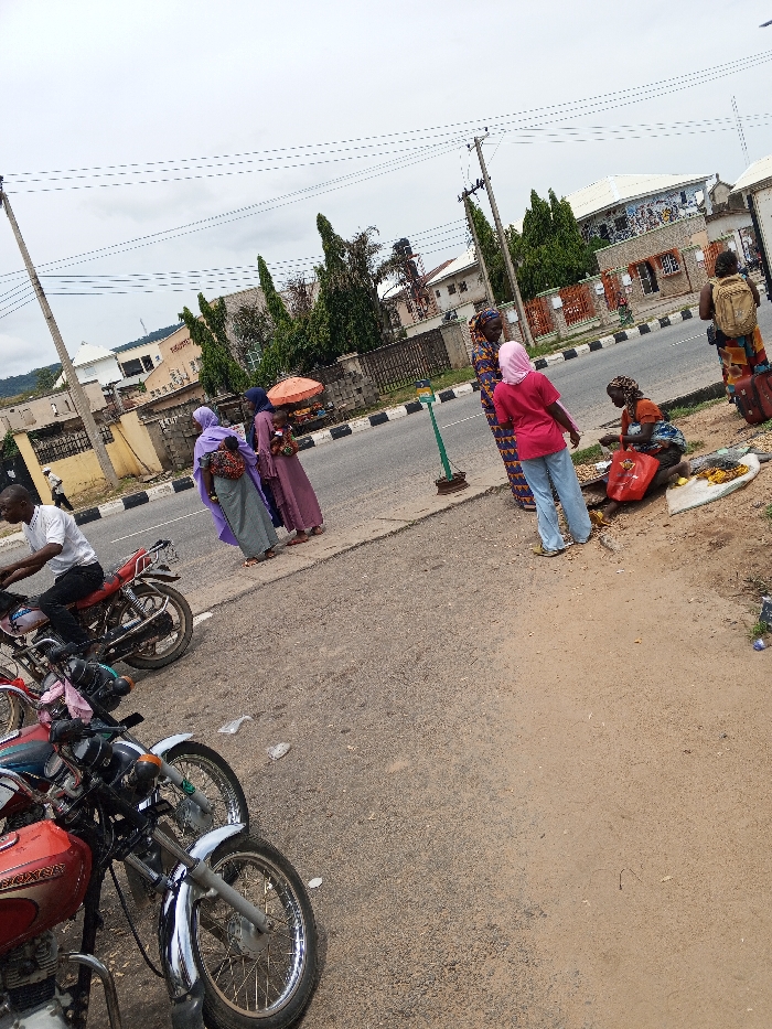 The image captures a roadside scene in Lokoja, Nigeria, under an overcast sky