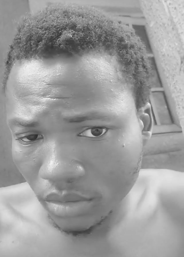 A medium close-up black and white shot shows a shirtless man looking downwards and slightly to his left