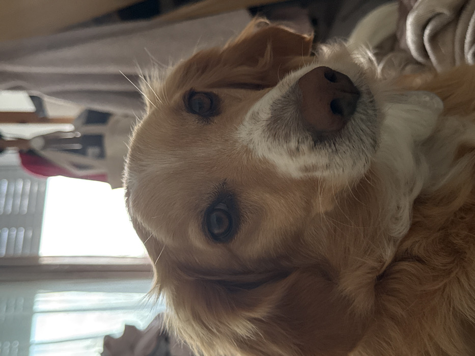 This image depicts a medium-sized dog positioned indoors within the Kalyvia Thorikou Municipal Unit, Greece. The dog, likely a spaniel-type breed, is seen from the chest up, facing the viewer directly. Its fur is predominantly light brown or golden, with distinct white markings on its muzzle, under its chin, and a stripe extending from its forehead between its dark, attentive eyes. Its nose is dark and appears moist. The ears are floppy and covered in longer, wavy fur, matching the body. The background is out of focus. To the left, a brightly lit window with horizontal blinds or slats is visible through a sheer, light-colored curtain, indicating strong natural light. To the right, indistinct forms suggest a cluttered indoor environment, possibly a bed or sofa with folded textiles. A blurred figure, potentially a person or a mannequin wearing a pink top, is faintly discernible in the upper right quadrant of the background. No specific action or interaction is discernible beyond the dog's direct gaze towards the camera.