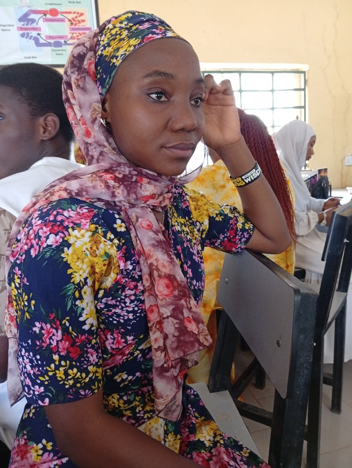 A young woman with dark skin sits in a classroom. She wears a floral dress with a matching hijab. Her headscarf has yellow and pink flowers. She rests her hand on her forehead, looking off to the side. Other students are visible in the background, along with classroom posters and furniture. One student wears a hijab, while another has braided hair. The room has cream-colored walls and is well-lit by a window.