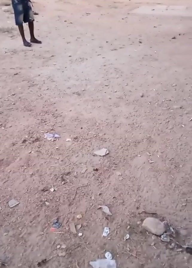 dirt and gravel ground with scattered trash. In the background, a shirtless person in shorts and shoes stands, their back toward the camera. They appear to be stationary. A few blurry buildings or structures are visible in the distance.