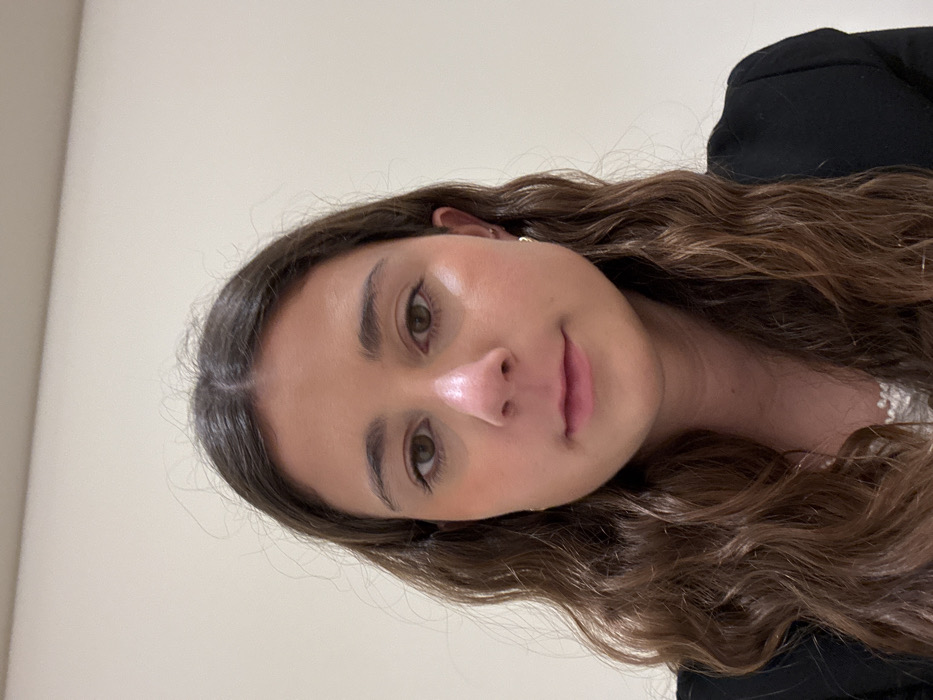 A young woman is captured in a close-up selfie. Her long, wavy brown hair cascades around her face. She has fair skin, full lips, and distinct eyebrows. Her eyes are a warm, hazel color. She is wearing a dark blazer or jacket, possibly with a white top visible underneath. The background is a plain, off-white wall. The image is slightly rotated.