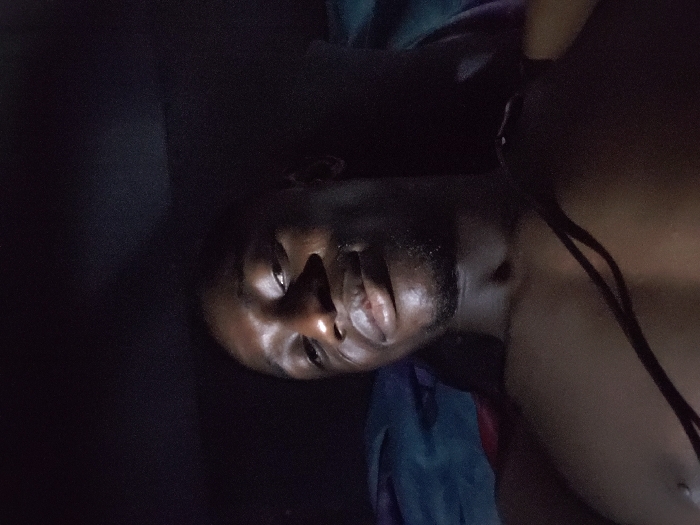 A close-up, sideways shot of a dark-skinned man's face and upper body. He is positioned to the right, facing slightly upward. The lighting is dim, highlighting his facial features, particularly the eyes, nose, and mouth. A hint of stubble is visible on his chin. A dark cord is seen draped across his bare chest. A bluish-green fabric appears near his shoulder. The background is dark and mostly obscured.