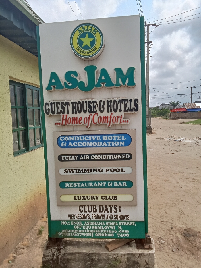 sign for a hotel and guest house called "Asjam" located at No.1 Engr. Ashishana Simpa Street, Off Udu Road, Ovwvi, N. The sign lists the services provided: conductive hotel & accomodation, fully air conditioned, swimming pool, restaurant & bar, luxury club, and club days: Wednesdays, Fridays and Sundays. The phone numbers are 07051647998 & 0806007406. The sign is placed on the side of a dirt road. The sign is green, white, and blue. The sign is on the side of a dirt road in front of what appears to be a brick building with a window and a small wall surrounding it. The background is a rural setting with trees, dirt roads, and a few buildings in the distance. The image is taken from a low angle, and the sign is in focus. The sign is facing the camera and the road is leading away from the camera.