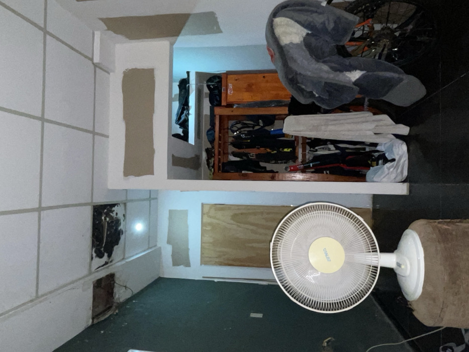 A room under renovation, featuring unfinished walls with repaired sections, exposed wiring, and repaired drywall. A small fan is positioned near a large wooden object. A shelf is filled with various items including a bicycle and clothing. The room has dark green carpeting.