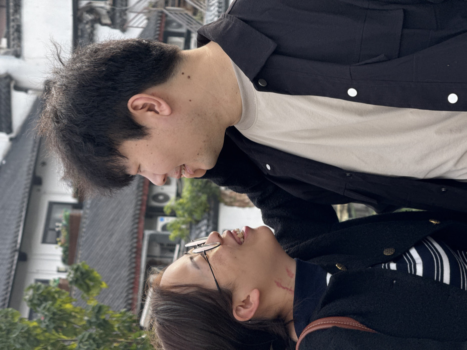 A man and woman stand closely together, heads near each other. The man wears a light t-shirt and dark jacket, looking down with a slight smile. The woman, wearing glasses, a dark jacket with gold buttons, and a striped shirt, looks upward and smiles. The background includes buildings with dark roofs and trees. The image appears slightly rotated.