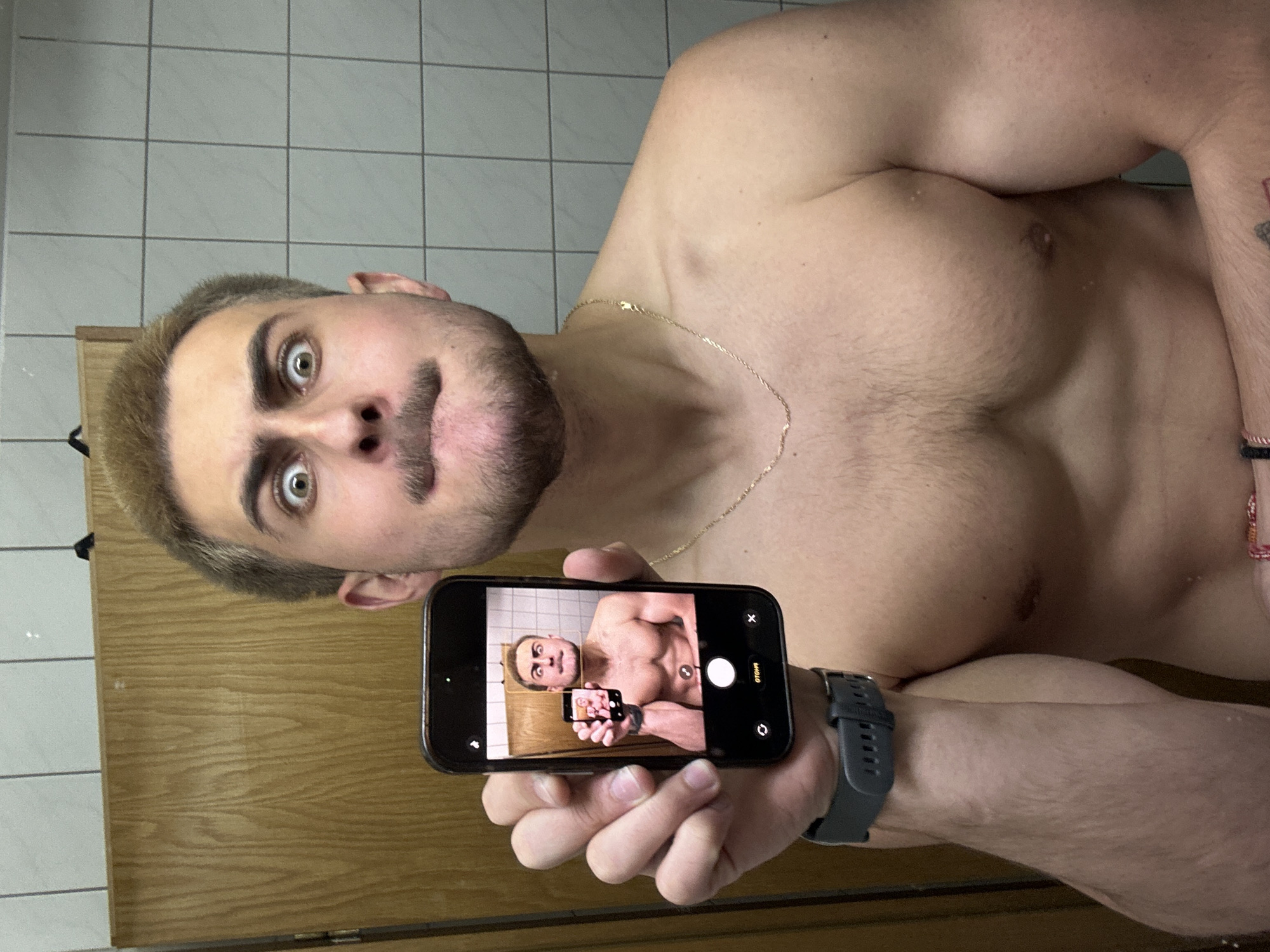 A male subject is shown taking a mirror selfie in a bathroom setting located in Essen, Germany. The individual has light brown hair, a mustache, and a short beard. He is shirtless, revealing a muscular physique, and wears a gold chain around his neck and a gray smartwatch on his left wrist. His facial expression features wide eyes and a puckered mouth. He holds a dark-colored smartphone in his left hand, positioning it to capture his reflection. The phone's screen displays a previous mirror selfie of the same individual, which itself contains a smaller phone showing an even smaller mirror selfie, creating a Droste effect. The background consists of light gray square tiles on the right side and a light brown wooden door on the left.