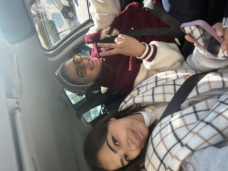 Two females are visible inside the cabin of a vehicle on a clear, sunny day in Meknes, Morocco. The image appears to be a selfie taken by the front passenger. The passenger, a female with dark hair, occupies the left side of the frame. She wears a light-colored top with gold-toned buttons and a beige, brown, and black plaid scarf draped over her shoulder, secured by a dark seatbelt. Her expression is a subtle smile directed towards the camera. Her left hand holds a light purple-cased smartphone, reflecting part of her scarf. The driver, also a female, is positioned to the right. Her dark hair is partially covered by a patterned headscarf, and she wears yellow-tinted sunglasses with thin frames. She exhibits a broad smile and looks directly at the camera. Her attire includes a two-tone jacket with a maroon/dark red plush body and cream/white plush sleeves with striped cuffs. A dark seatbelt crosses her chest. Her right hand is raised, displaying a "peace sign" (V-sign) with her index and middle fingers; a gold-colored ring is visible on her ring finger. The vehicle's interior features a light grey headliner and a visible sun visor. Through the windows, a blurred exterior environment is discernible, including trees, a distinctive light blue wall with a white wave-like pattern, and parked vehicles, suggesting an urban or suburban setting within Meknes.