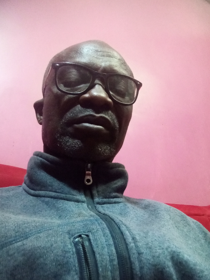 A close-up shot of a bald, dark-skinned man wearing eyeglasses and a zipped-up gray fleece jacket. His face is the main focus, with a serious expression. He has a neatly trimmed beard. The background is a solid light pink color, which contrasts with the man's dark skin and clothing. A red object, perhaps a piece of furniture, is visible at the bottom corner of the image. The lighting is somewhat uneven, creating shadows on his face.