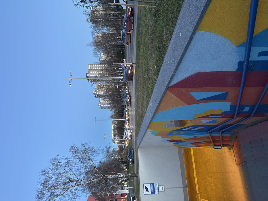 A colorful mural adorns the wall of a tunnel. The mural depicts abstract shapes in shades of red, blue, yellow, and white. Streetlights and tall buildings are visible in the background beneath a clear blue sky. Trees line the sidewalk. Cars drive on the road between the sidewalk and the buildings. A CCTV sign is mounted on the wall.