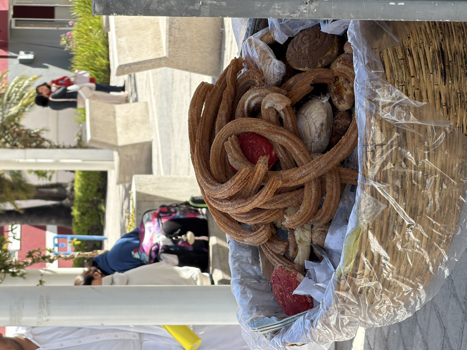 A container filled with churros, and other pastries, sits on a cart covered with a plastic liner. Some churros are sprinkled with a reddish substance. Other items in the container include pan dulce. The cart is in an outdoor setting, with people and plants visible in the background.