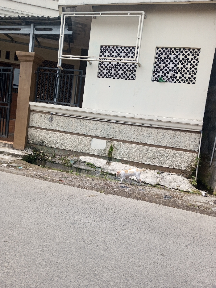 The image displays an outdoor scene in Namthoung, Laos, with a building on the right and a paved street in the foreground. A lean, medium-sized dog, predominantly white with light brown/tan patches, walks from right to left on the uneven dirt and concrete ground strip between the street and the building's facade. The street is a textured grey asphalt surface. The building's lower section features a textured, greyish-beige stucco wall with two horizontal bands, exhibiting water stains and moss growth at its base, where a narrow drainage channel is present. The upper wall, painted light cream, contains two rectangular openings fitted with decorative, perforated metal screens patterned with floral-geometric designs. A white, rectangular metal frame, possibly a clothes drying rack, is attached horizontally to the upper wall, with a lower supporting bar. To the far left, a brown pillar, dark metal railings, and a portion of a covered area with a corrugated metal roof are visible. The scene is illuminated by natural daylight.
