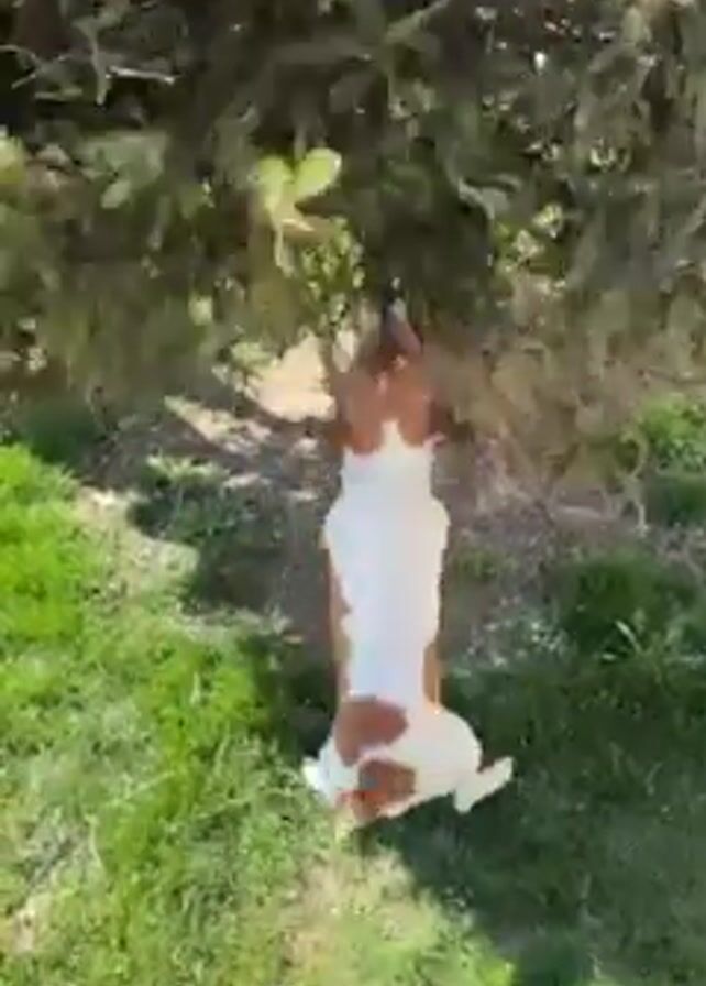 medium-sized dog standing on its hind legs and reaching up to a small evergreen tree. The dog is mostly white with brown patches. The tree is on a lawn of green grass, with the sun casting a shadow on the lawn. The camera is positioned close to the dog, capturing its efforts to reach the tree. The scene appears to be in a backyard or a park, during daytime. A voice can be heard in the background.