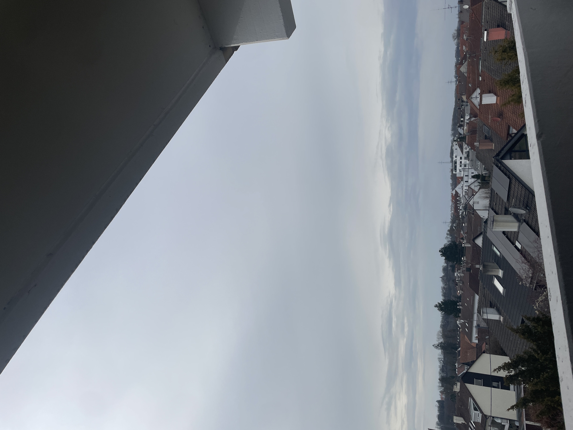 The image displays an overhead perspective of a residential district in Senden, Germany, under a uniformly overcast, light grey sky with low-hanging clouds. The immediate foreground features a white-painted concrete balcony railing at the bottom edge and a dark grey concrete overhang in the upper right quadrant, indicating an elevated vantage point. The middle ground is densely populated with residential structures, primarily 1-3 story houses with various roof types. The majority of these roofs are gabled, covered in red, brown, or dark grey tiles. Numerous white-capped chimneys, rectangular skylights, and dark rectangular solar panels are visible on the rooftops. Scattered evergreen trees are interspersed among the buildings. Beyond the immediate housing area, a horizontal band of bare deciduous trees forms a treeline, with a higher, forested elevation discernible in the far distance. Against the distant sky, two prominent lattice-work power line pylons are visible. No human figures or vehicles are discernible within the frame.
