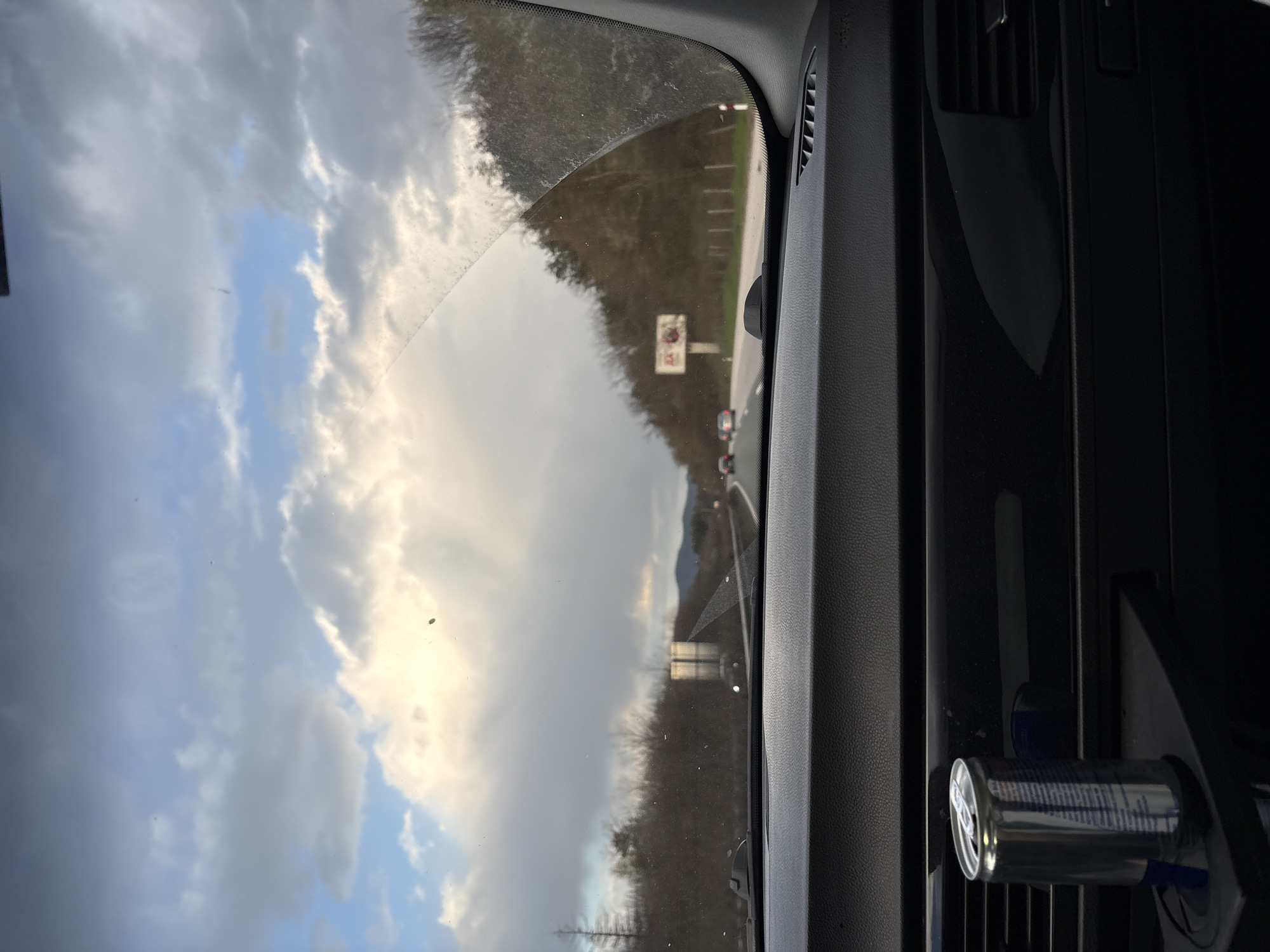 view from inside a vehicle, presumably a car, with the dashboard and windshield visible. Outside the windshield, a road is visible, flanked by trees. The sky is cloudy with patches of blue. A road sign is present on the side of the road. A can of soda is placed in the vehicle's center console. The location could be near Trudovets, Bulgaria, as it is in the vicinity of a mountain road and has a mountainous area nearby.