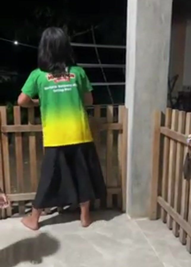two young children standing on a porch in front of a wooden fence at night. The older child is wearing a green and yellow shirt and black pants and is facing away from the camera, leaning on the fence. The younger child is wearing a white shirt and green patterned pants and is walking around. The porch is made of light-colored tile and has a concrete pillar on the right side. A tree and some houses can be seen in the background. The lighting is dim, with a light source above and to the left of the children. There is audio playing.