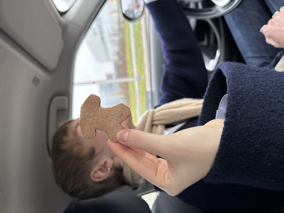 Inside a car, a person holds a brown, dog-shaped cookie between their thumb and forefinger. The car's interior is visible, with a window showing blurry scenery. A steering wheel and the driver can be seen, as well as a beige scarf. The person holding the cookie wears a dark blue coat. The cookie is the focus.