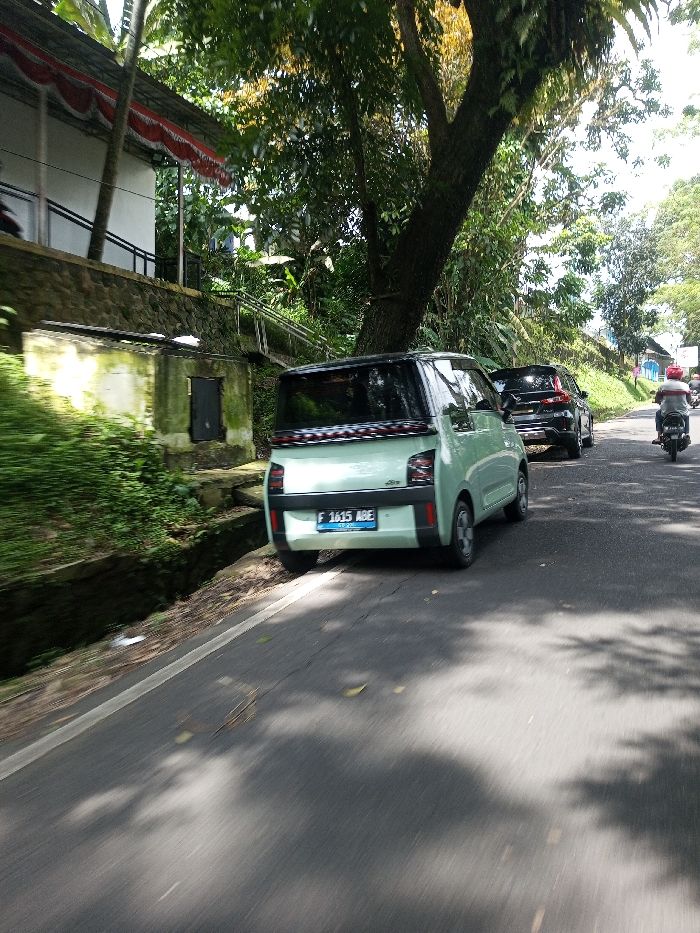 The scene depicts a daylight roadside environment in Khajuripada, India. An asphalt road occupies the foreground and midground, exhibiting visible cracks and dappled shadows from overhead foliage. On the immediate left, a narrow concrete drainage ditch runs parallel to the road, bordered by dense green vegetation and a moss-covered concrete structure with a dark opening. Further left and elevated, a white building featuring a red-trimmed awning rests on a stone retaining wall. Centered on the left side of the road, a light green compact vehicle, possibly an electric model, is parked facing away from the viewer. Its rear features a black roof section, dark taillights, and a license plate displaying "F 1615 ABE" with blue characters on a white background. Directly behind this vehicle, a dark-colored SUV is also parked, partially obscured. Further down the road, a lone individual wearing a red helmet is visible operating a motorcycle, moving away from the viewer. The background and right side of the road are characterized by abundant green trees and dense vegetation under a bright sky. The perspective suggests the image was captured from a moving vehicle.