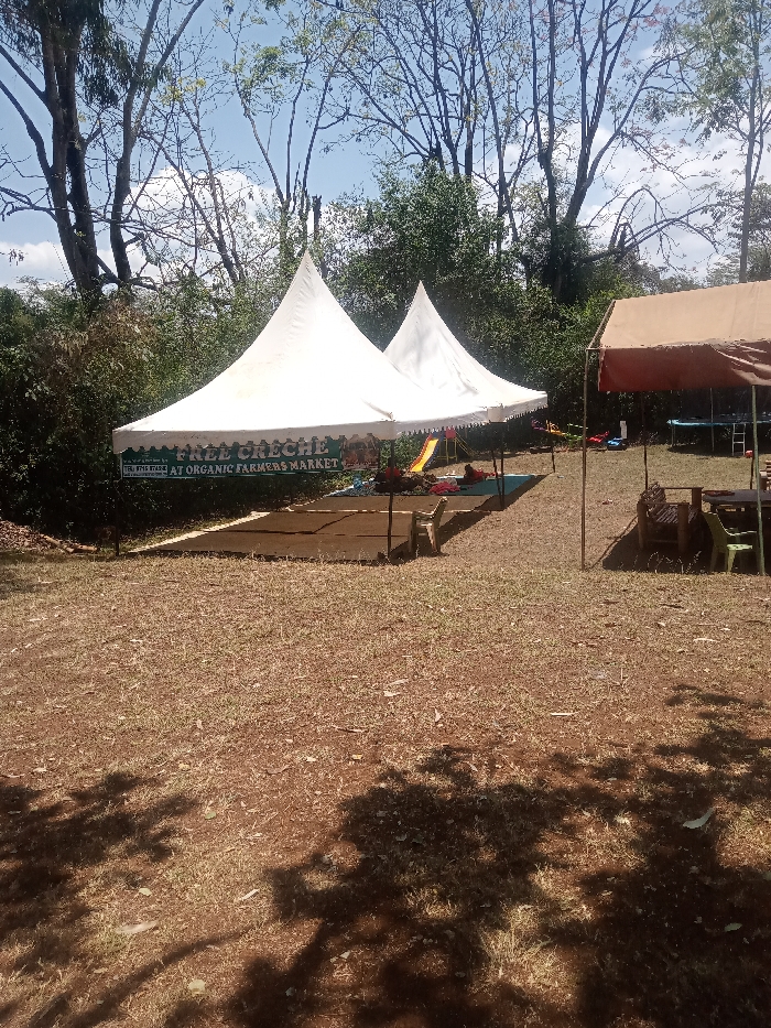 Two white peaked tents stand in a grassy outdoor area. One tent is labeled "Free Creche at Organic Farmer's Market." A small slide is visible between the tents. A brown canopy tent sits to the right, near a wooden bench and green chair. Trees are present in the background. The ground is mostly brown with patches of green grass and shadows. The sky is partly cloudy with some blue visible.