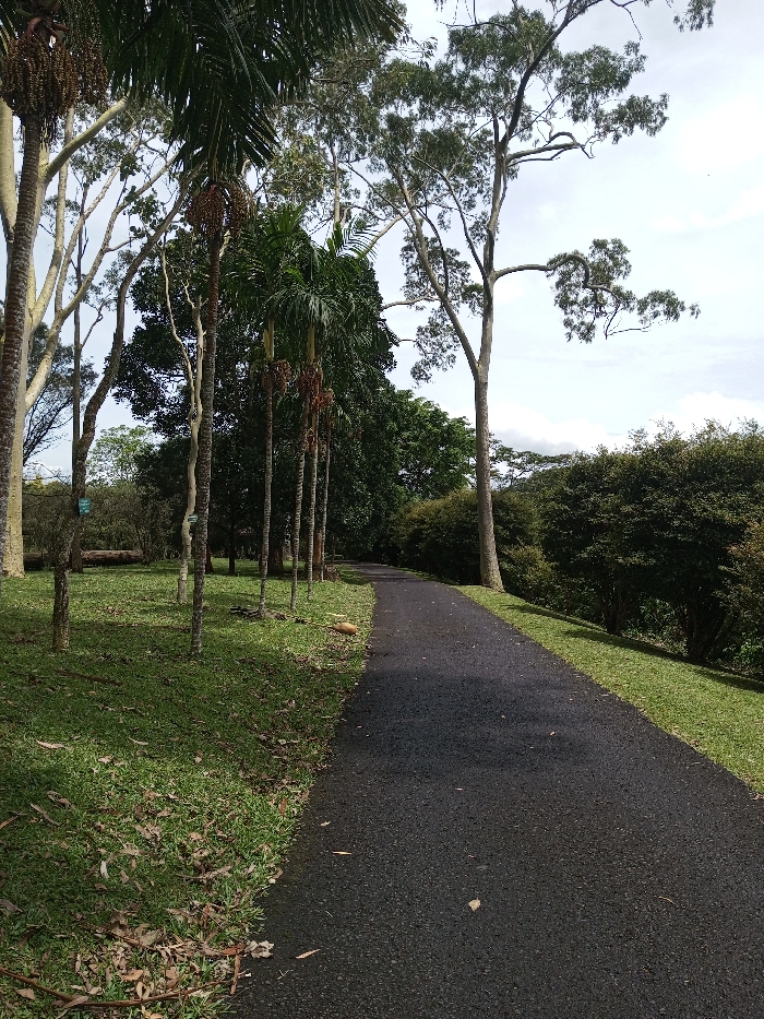 The image depicts an outdoor park or botanical garden environment within the city of Bijanwada, India, under an overcast sky. A dark asphalt pathway, approximately 1.5 to 2 meters wide, extends from the lower center-right, curving gently uphill and to the right, receding into the background. To the left of the pathway, a mown grassy area is visible, scattered with dry leaves. Within this area, several tall, slender trees with light-colored trunks stand, along with a distinct row of five palm-like trees featuring green fronds and clusters of brown, pendulous fruit or seeds. A small, light-colored sign is affixed to a tree trunk on the far left. Denser green foliage forms a background behind these trees on the left. To the right of the pathway, a grassy bank slopes downwards, bordered by a thick mass of green shrubs and trees. A prominent, very tall tree with a light-grey trunk and a sparse green canopy stands on the right side of the frame, silhouetted against the cloudy sky. No individuals, animals, or active subjects are present in the scene.