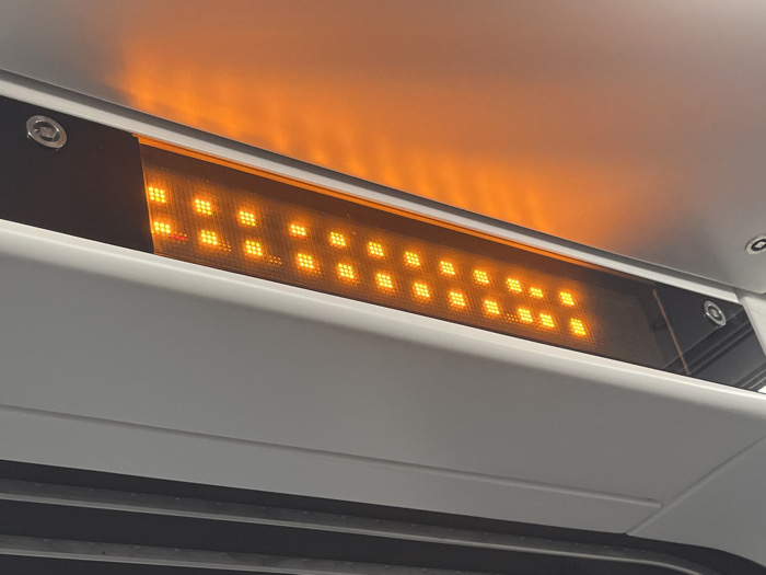- "An upward-angled view captures an illuminated amber LED display unit integrated into the ceiling or upper paneling of a public transport vehicle, likely a light rail train operating on the Tel Aviv Light Rail Red Line in Petah Tikva, Israel" by FM-EBxyC2, licensed under CC BY 4.0