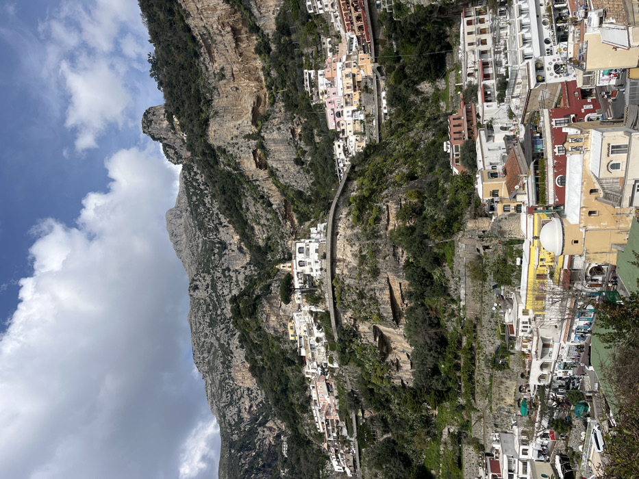 The image presents a panoramic view of a densely built hillside town, identified as being located in Arienzo, Italy. The scene is dominated by a rugged, steep mountain range in the background, composed of grey rock formations interspersed with green vegetation, rising towards a partly cloudy blue sky. The town itself is meticulously constructed into the undulating terrain, with numerous multi-story buildings cascading down the slopes. Architectural styles vary, featuring a mix of white, pastel pink, yellow, and terracotta-colored facades, often topped with red-tiled roofs. A prominent white church with a visible dome and a bell tower (campanile) featuring a spire is centrally positioned on a terraced plateau mid-slope. Below it, a wide, paved, winding road or pathway forms a significant curve around the hillside, with additional buildings situated both above and below it. Further down the slope, the buildings become more densely packed, revealing intricate layers of architecture and narrow pathways. Some ground-level structures in the lower foreground appear to be commercial establishments, suggested by small awnings and clusters of indistinct figures on the pedestrian areas. Another building with a lighter-colored dome is visible in the lower-central portion. Green foliage, including trees and shrubs, is integrated throughout the town and along the natural rock formations, providing a contrast to the man-made structures. The scene is illuminated by natural daylight, casting some shadows and highlighting the architectural details.