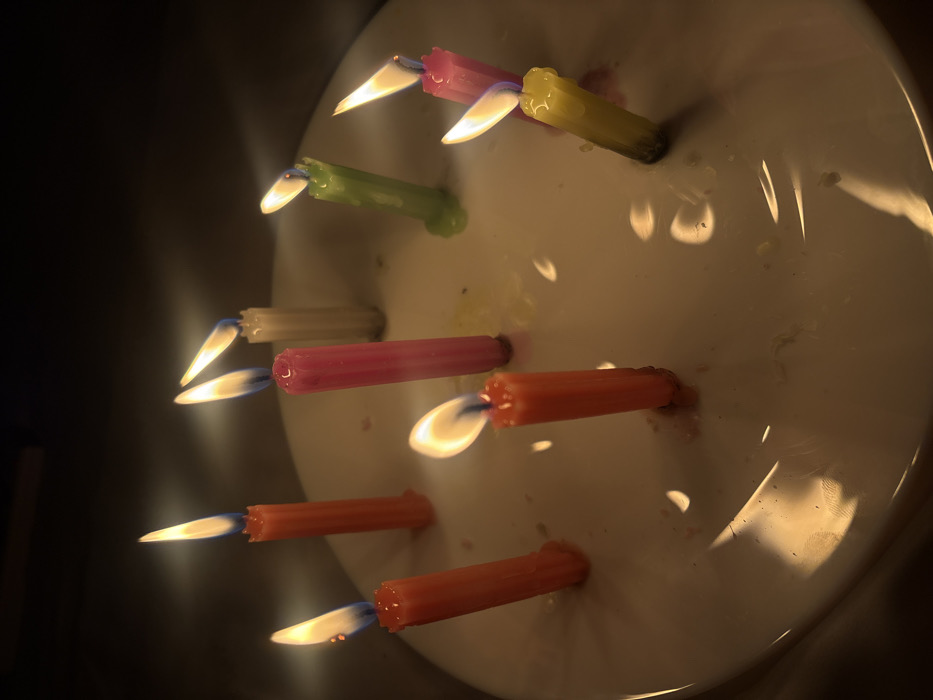 - "A close-up, slightly angled shot features a white, circular cake adorned with ten lit birthday candles in various colors: pink, orange, yellow, green, and white" by FM-htt4C2, licensed under CC BY 4.0