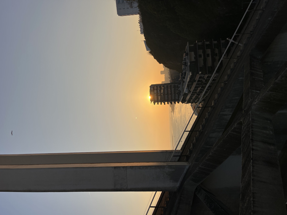 The scene depicts a sunset over the Douro River in Porto, Portugal, observed from the upper deck of the Dom Luís I Bridge. In the left foreground, a large, weathered concrete support beam of the bridge extends vertically, displaying light and shadow from the setting sun. Below and to its right, a complex arrangement of diagonal and horizontal concrete structural elements, consistent with bridge construction, is visible, interspersed with dark metal railings. The sky transitions from a pale blue at the top to a bright golden-orange at the horizon, indicating sunset. A single bird, silhouetted against the sky, is in flight in the upper left quadrant. A small, bright circular object, consistent with a celestial body like the moon or a planet, is visible in the mid-left sky, close to the horizon. The setting sun is positioned at the horizon, partially obscured by the upper stories of a multi-story building with a distinctive stepped, angular architecture and numerous windows. This building stands on a sloped bank or cliff overlooking the Douro River. To the right of this building, a steep, dark, densely vegetated cliff face rises abruptly, with a light-colored building partially visible at its crest on the distant horizon. The Douro River occupies the midground, its surface reflecting the intense golden light of the sun. Faint outlines of distant land or cityscape are discernible across the river. No human figures or specific interactions are visible within the frame.