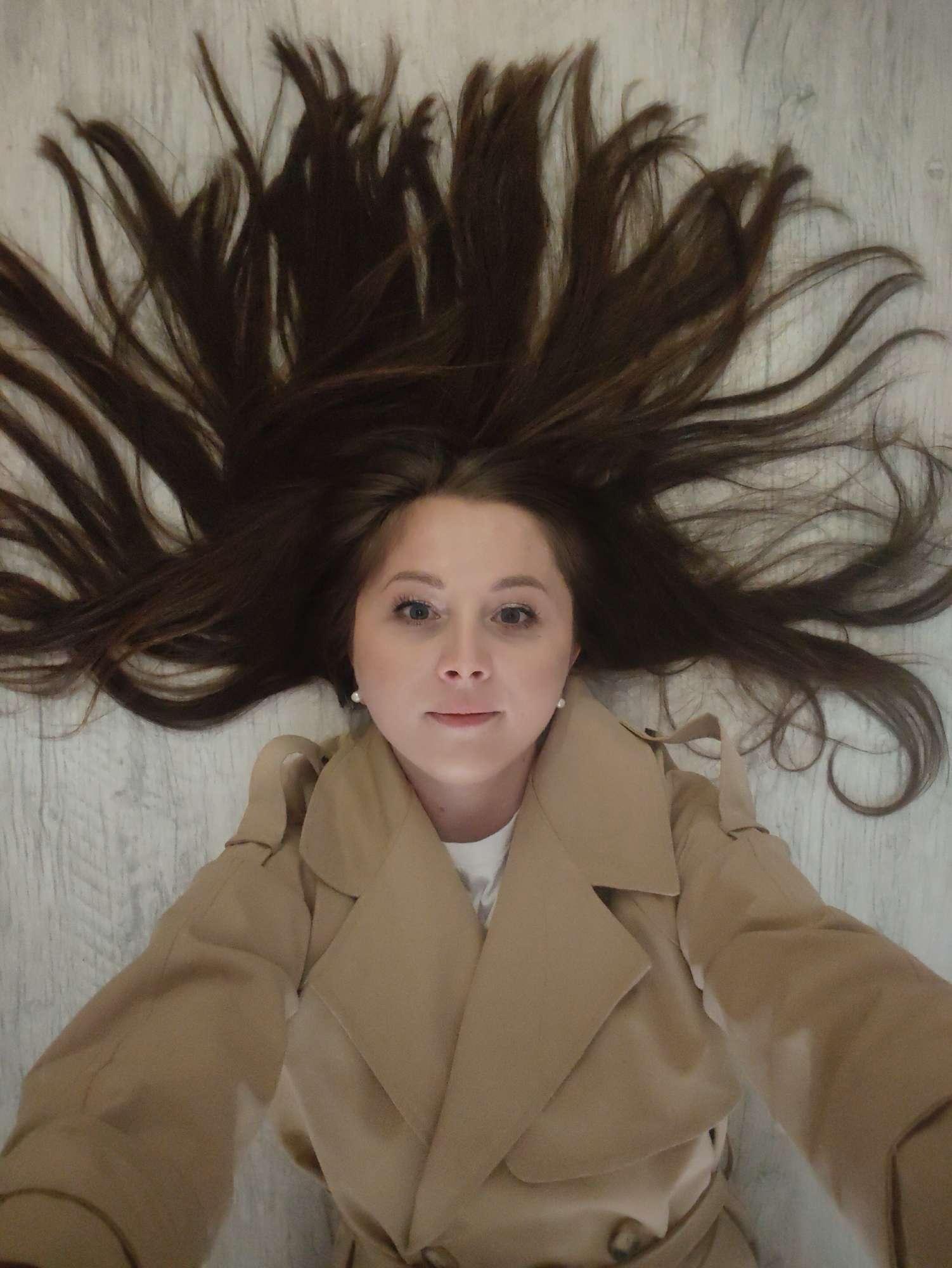 A person is lying on a light-colored wooden floor, taking a selfie from above. The person has long, dark brown hair spread out around their head. They are wearing a beige trench coat over a white top. They are looking directly at the camera. The location is unknown.