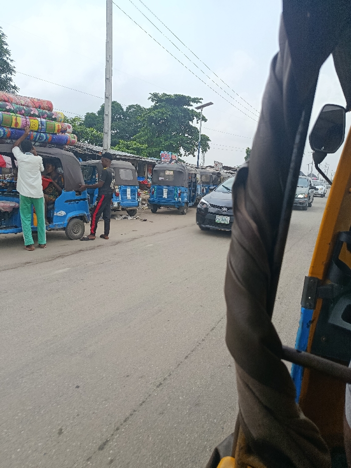 This image captures a street scene in Warri, Nigeria, under an uniform overcast sky. The viewpoint is from within a yellow and blue tricycle, with a brown fabric element and a side mirror partially visible on the right. On the left side of the asphalt road, a blue tricycle is stationary, its roof heavily laden with numerous colorful, rolled mattresses or mats secured by yellow straps. A male figure wearing a white short-sleeved shirt and light green trousers stands on the left side of this tricycle, hands raised, appearing to adjust or secure the overhead load. Another male figure, dressed in a black t-shirt and black trousers with red vertical stripes, stands beside the driver's side of the same tricycle, seemingly engaged in an interaction. A person is dimly visible within the passenger compartment of this loaded tricycle. Beyond this immediate activity, a series of identical blue tricycles are parked along the roadside, adjacent to a row of low-rise structures with corrugated metal roofs, indicative of informal shops or stalls. A black Toyota sedan, with a partially visible license plate starting "OSU-", is positioned on the road in front of these parked tricycles. Further down the street, additional vehicles, including cars and vans, are present, indicating ongoing traffic. Utility infrastructure includes a tall, light-colored utility pole with multiple overhead wires spanning across the upper left frame and a street light pole with a solar panel further in the background. Green foliage from trees is visible behind the roadside structures. The road surface is asphalt, without visible lane markings.