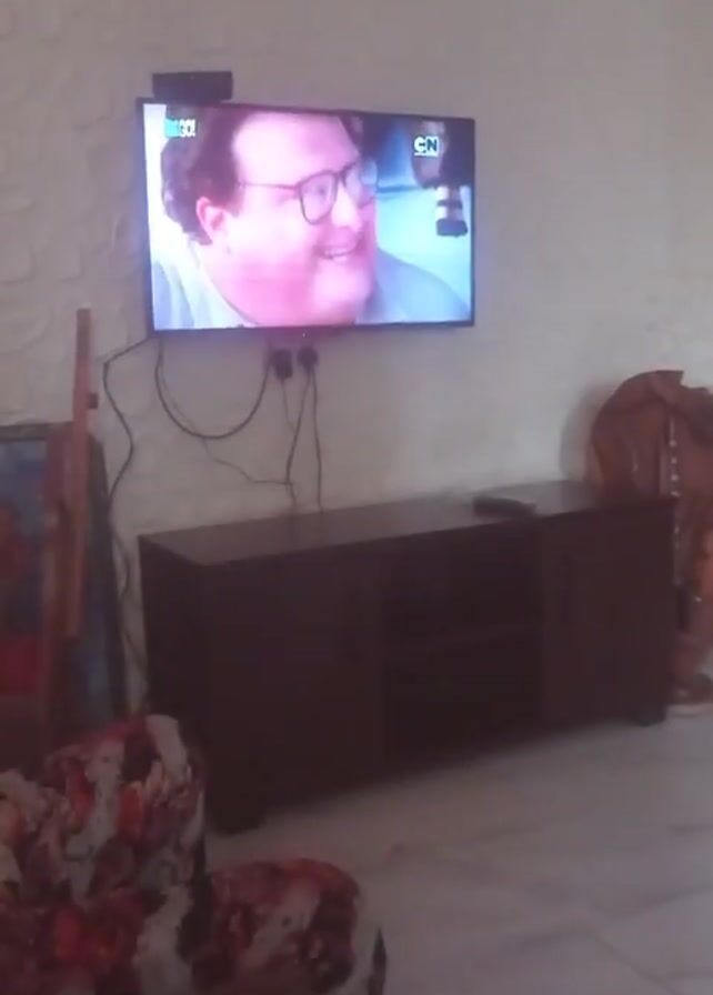 TV on a wall in a living room. A dark brown TV stand is below the TV. A floral patterned chair is in the foreground. The TV is showing a scene with two men, one is white and one is Black. There is a painting on an easel and a wooden decorative object near the right side of the stand. The room has light-colored tile flooring.