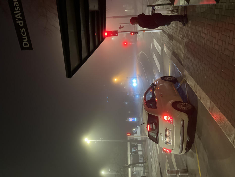 A street scene at night is heavily obscured by fog. A pedestrian stands on the sidewalk by a crosswalk near a building with a sign reading "Ducs d'Alsace." A white car is stopped in the street, with its taillights visible. Streetlights illuminate the fog, creating a yellow glow. Traffic lights are red. Visibility is poor due to the dense fog.
