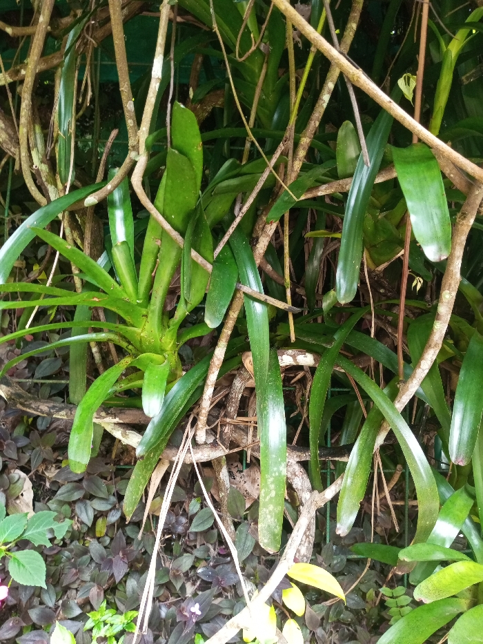 The image displays a dense, verdant botanical scene located in the city of Kanand, India. A prominent central plant, characterized by a rosette of broad, glossy green, strap-like leaves, dominates the midground. Surrounding and intertwining with this plant are numerous light brown, gnarled woody vines and branches of varying thicknesses, some appearing leafless, others with sparse foliage. In the lower portion of the frame, a dense ground cover consists of small, dark purplish-green, ovate leaves, interspersed with smaller light green plants and tiny pale flowers. A faint green mesh or trellising structure is discernible in the background, partially obscured by the thick vegetation. The scene is illuminated by natural, diffused light, indicating an outdoor, possibly shaded, environment. No individuals or active subjects are present.