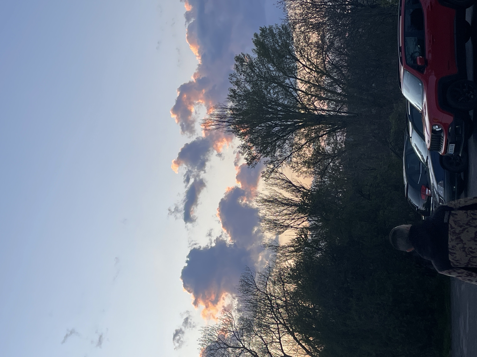 landscape scene oriented vertically. On the left side, there is a sky with light blue and purple hues, along with clouds that have an orange tint at their edges. Moving towards the right, there are trees with bare branches and some green foliage. Adjacent to the trees, several vehicles are parked. The foreground has a person in the lower right with a dark jacket with camo print and hat. Location is unknown.