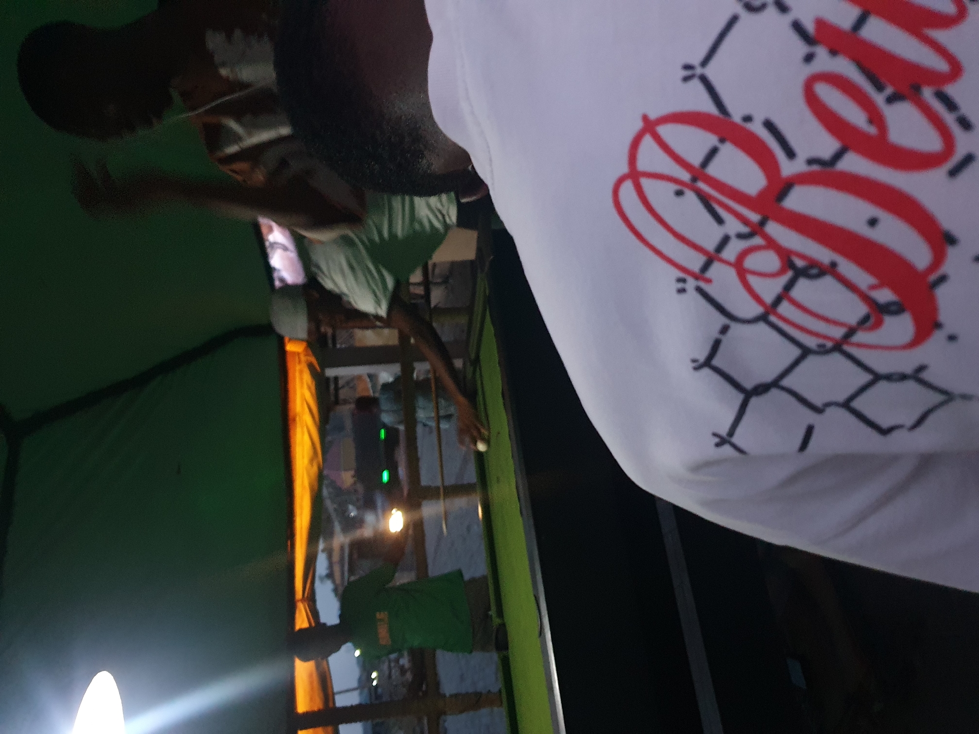 The scene depicts a semi-enclosed recreational area in Lokoja, Nigeria, at dusk or night, under a dark green tarpaulin canopy