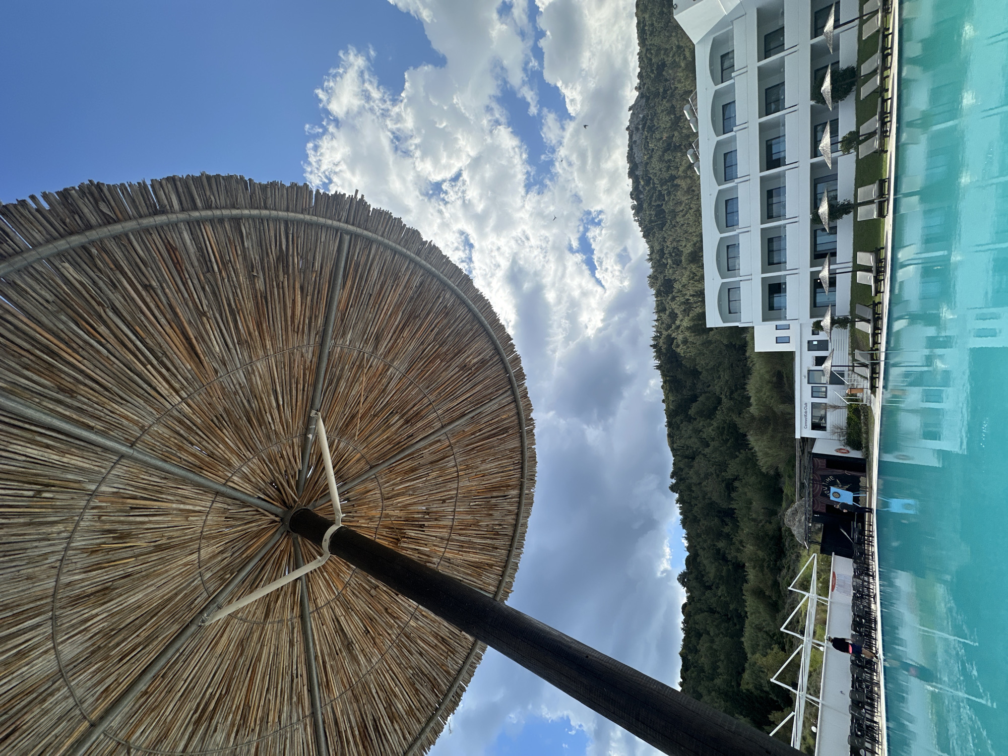 - "view from under a straw beach umbrella towards a building and pool" by FM-kBeqb2, licensed under CC BY 4.0