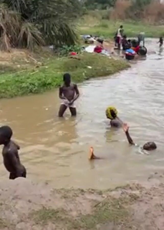 group of people, mostly children, in and around a muddy river or stream