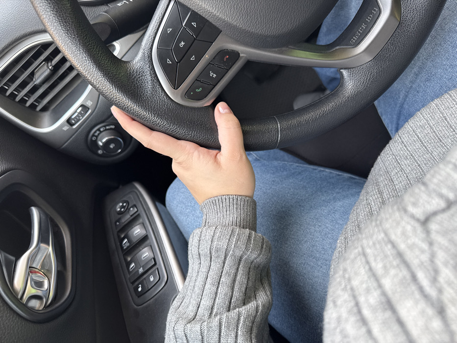 The image displays the interior of a vehicle, specifically the driver's compartment, from a first-person perspective
