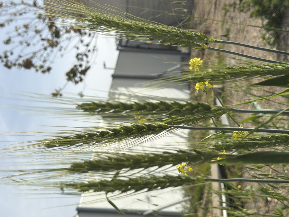 Close-up of several stalks of green wheat against a background featuring the sky, trees, and a building
