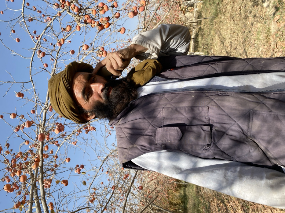 An adult male with a dark, full beard and mustache, wearing an olive-green turban, a light-colored long-sleeved shirt, and a dark grey quilted sleeveless vest with pockets, stands in an orchard in Bazar-e Panjva'i, Afghanistan. He holds a dark mobile device to his right ear with his right hand, his head slightly tilted. The background features numerous deciduous trees with bare branches laden with small, round, orange fruits, consistent with persimmons, set against a clear blue sky. The ground beneath the trees is covered with dry leaves and sparse vegetation.
