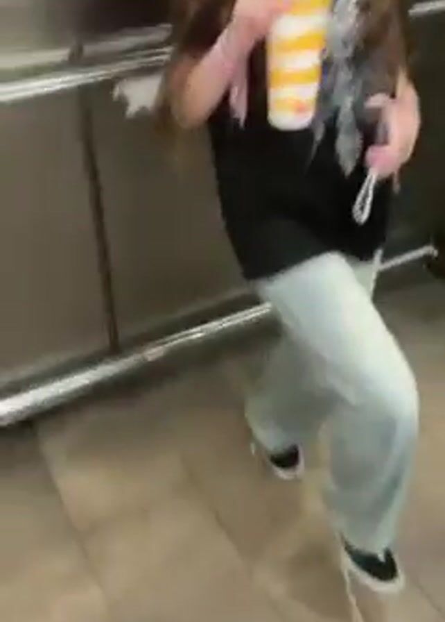 Inside an elevator, a young woman with long brown hair wearing a black t-shirt with a graphic, light blue jeans, and black and white sneakers is holding a McDonald's drink. She is laughing and shaking the drink, causing the camera to move erratically. The elevator has stainless steel walls and a floor with beige tiles. The elevator's control panel is visible, but the buttons are blurry.