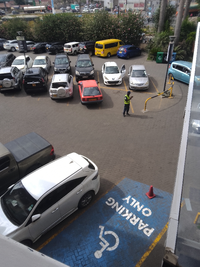 This image depicts an outdoor parking lot in Nakuru, Kenya, viewed from an elevated perspective