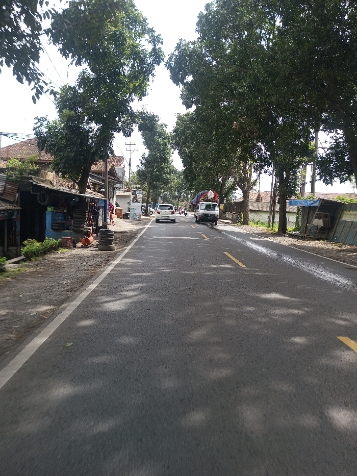 The scene depicts a straight, two-lane asphalt road in Khajuripada, India, viewed from a low perspective, looking down the road. The road surface is grey with a solid white line marking the left edge and a faded solid yellow centerline. Tree shadows dapple the road, and some areas appear wet or reflective. On the left side of the road, a dirt shoulder fronts a series of informal commercial structures. The closest structure features a corrugated metal roof, wooden supports, and blue painted walls, displaying stacked tires, an orange air compressor, and various tools, suggesting a repair or service shop. Beyond these shops, traditional residential buildings with reddish-brown tiled roofs are partially visible amidst dense green foliage and utility poles carrying multiple power lines. On the right side, a dirt shoulder transitions into dense green foliage. A makeshift structure composed of corrugated metal sheets stands closer to the road. Further back, more residential structures with tiled roofs are discernible. Vehicular traffic in the mid-ground moves away from the viewer. A white hatchback car occupies the left lane, followed by a white light truck with a dark tarp covering an elevated load. Several motorcycles or scooters are visible further down the road behind these vehicles. Large, mature green trees line both sides of the road, forming a canopy overhead. The sky is bright white, indicating daylight conditions. No clearly discernible individuals are visible.