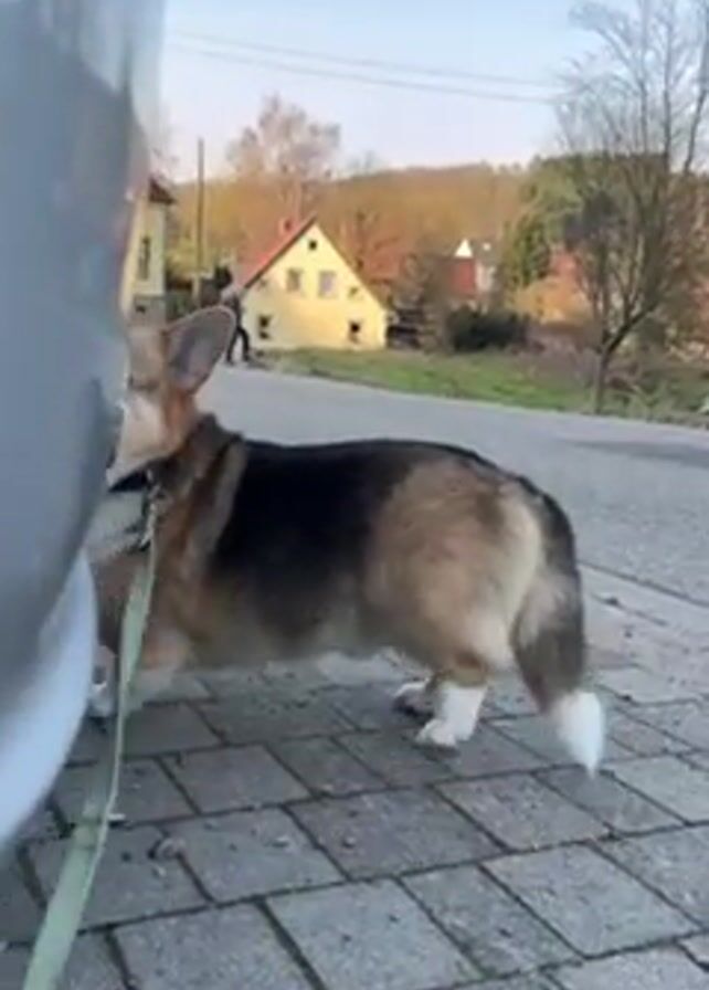 fluffy corgi, black and tan with white paws and a short tail, standing near the bumper of a white car on a paved street. The dog is on a green leash. In the background, a rural setting includes a yellow house with a red roof, a few bare trees, and a sloped, green, grassy area. The sky is light blue. The dog briefly looks into the camera then moves back towards the car bumper.