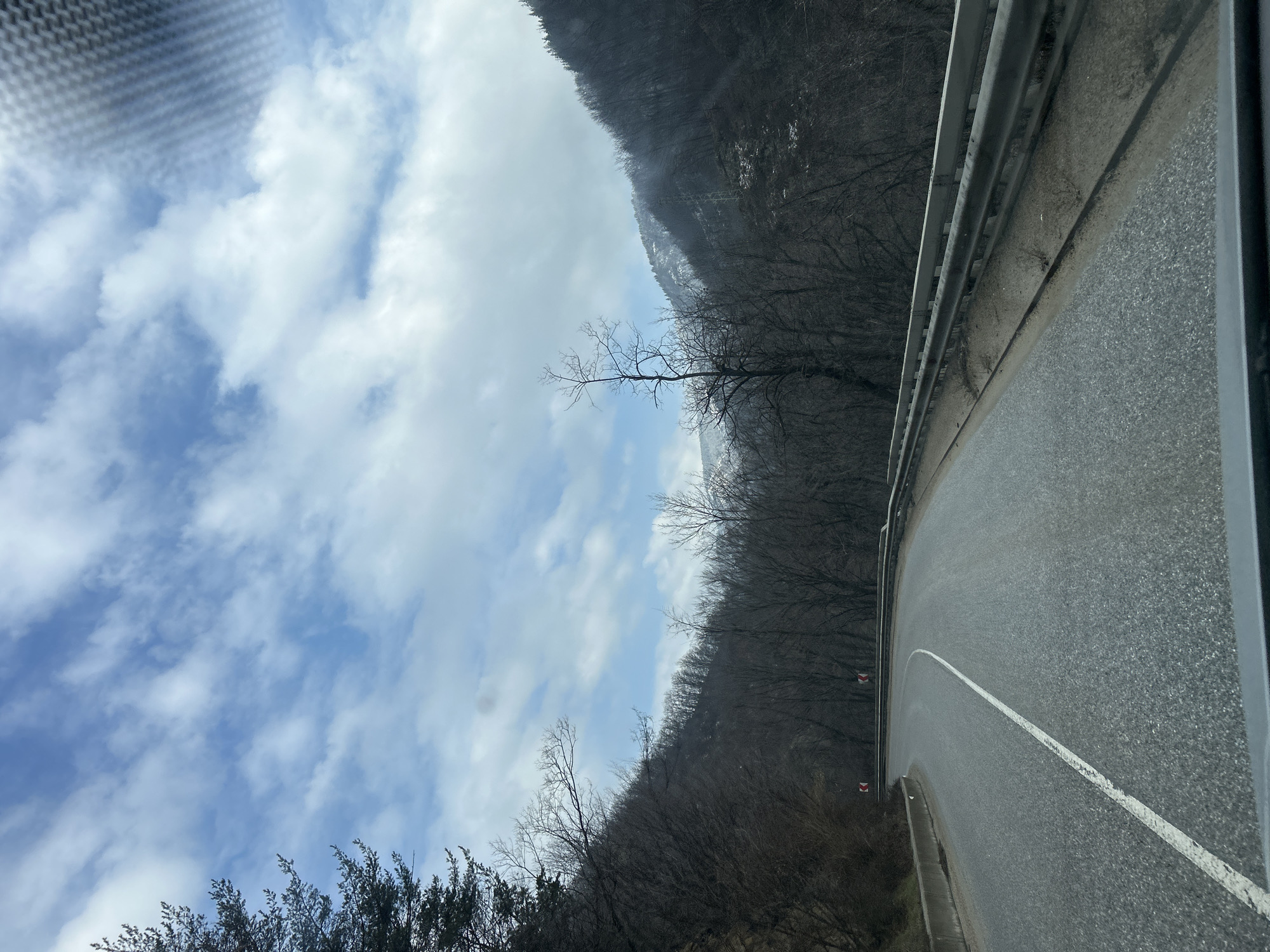The image depicts a gray asphalt road curving left through a mountainous and forested landscape near Hvoina, Bulgaria, observed from a vehicle's interior. A solid white line runs along the center-left of the road, marking the lane division. A multi-segment metal guardrail extends along the right edge of the road. Two red and white chevron signs, indicating a sharp left curve, are positioned on the left side of the road, beyond a low concrete barrier. The surrounding hills are densely covered with mostly bare deciduous trees, suggesting late winter or early spring. Patches of snow are visible on some higher slopes, particularly on the right, where a tall power transmission pylon is also discernible. A singular evergreen tree is partially visible in the upper left quadrant. The sky is light blue with scattered white clouds. The dark top of a vehicle's dashboard or windshield frame occupies the bottom edge of the frame.
