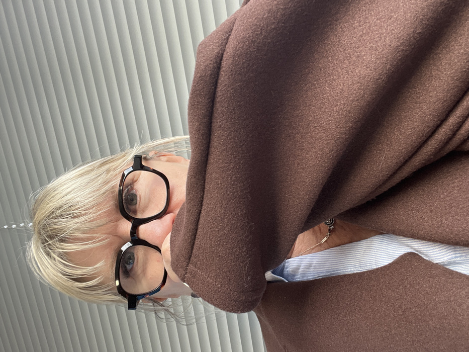 An indoor scene in Saint-Galmier, France, depicts a close-up of an individual, from the chest up. The individual, likely female, has blonde hair styled with bangs and wears eyeglasses with dark, multi-faceted frames. A brown, textured, heavy-fabric garment obscures the lower portion of the face, from the nose down. Beneath this garment, a light blue and white striped collared shirt is visible. A thin chain necklace with a dark, ornate circular pendant rests at the individual's neckline. The background features light gray horizontal window blinds.