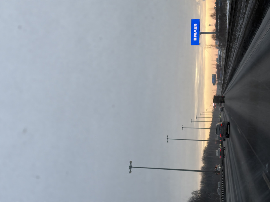 A multi-lane highway in Zanevka, Russia, is depicted under an overcast, light gray sky with a low-lying orange-yellow glow at the horizon, indicative of dawn or dusk. The wet, dark asphalt surface of the highway occupies the foreground and midground, showing multiple traffic lanes. Vehicle activity includes numerous passenger cars and at least one commercial truck, all traveling away from the vantage point of the camera. Several vehicles exhibit illuminated taillights. A linear arrangement of tall streetlights, each equipped with multiple lamp heads, runs parallel to the left edge of the highway. The left roadside comprises snow-covered ground transitioning into a dense stand of leafless deciduous trees. The right roadside features snow-dusted terrain and sparse vegetation. A large, freestanding, illuminated blue billboard bearing the white text "MAER" is positioned on the right side of the highway. Distant structures on the right, consistent with industrial or commercial facilities, are also visible, along with additional billboards.
