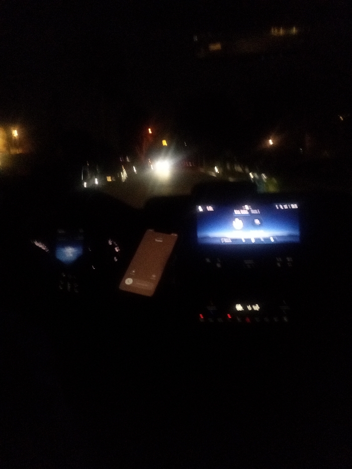 The image depicts a nighttime scene from inside a vehicle, likely in motion, on a street in Los Angeles, United States of America. The perspective is forward through the windshield, showcasing the vehicle's interior dashboard and the external environment. Within the vehicle, a portion of the dashboard and center console are visible. An illuminated infotainment screen, centered in the console, displays the "Sirius XM" logo and what appears to be a power or mute icon. Below this screen, a row of controls features several illuminated red indicator lights. To the left of the infotainment screen, a smartphone rests on a surface, its screen displaying a user interface with text including the name "Taylor." Outside the vehicle, the street ahead is dark, with illumination primarily from artificial sources. Bright headlights from an oncoming vehicle are visible in the distance, alongside multiple sets of vehicle taillights. Scattered yellowish light sources, indicative of streetlights, are also present along the street. No individuals are distinctly visible within the vehicle or in the external environment.