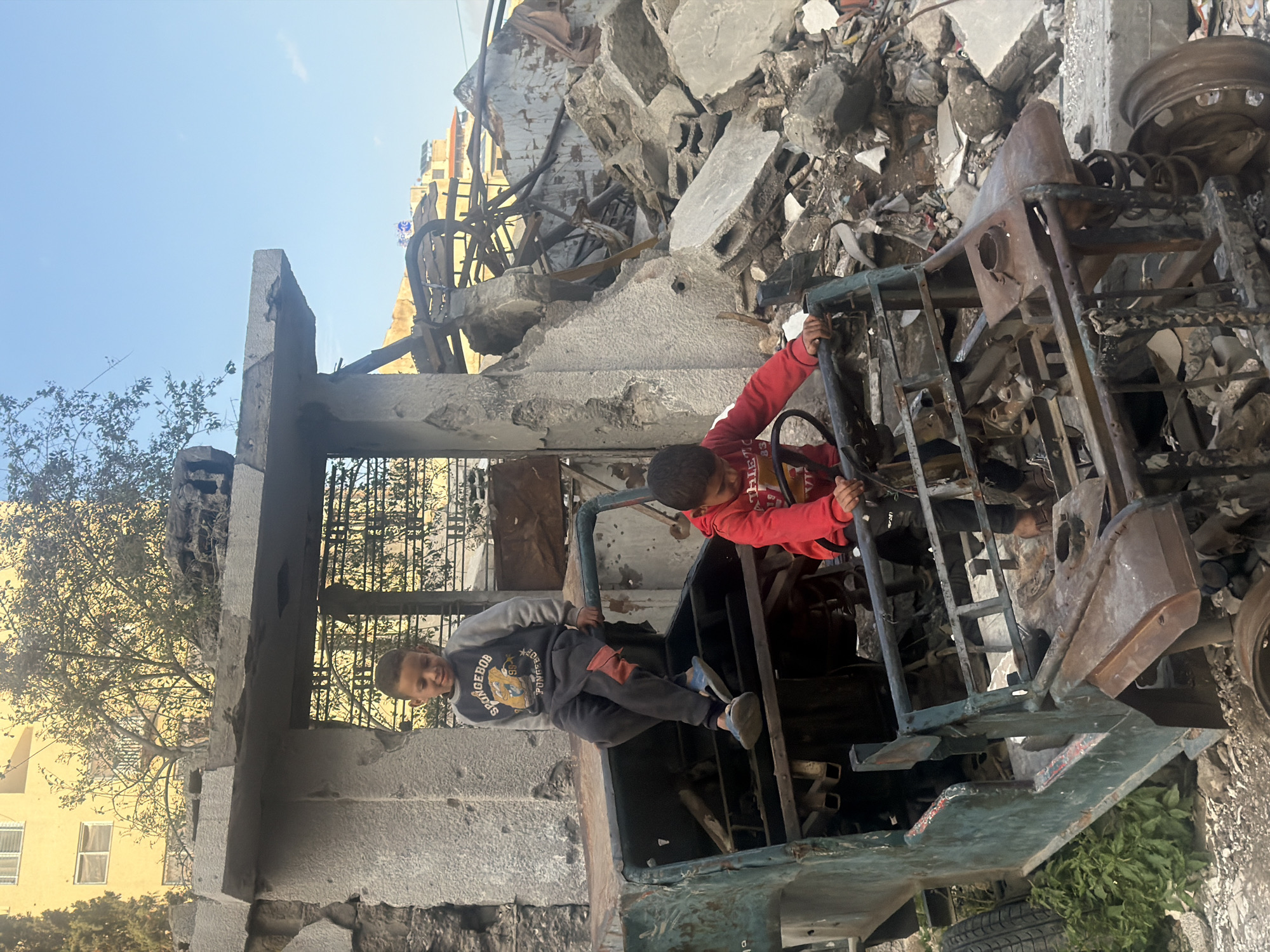 Two young boys are interacting with a heavily damaged or destroyed vehicle amidst a scene of extensive urban destruction. The older boy is in the driver's seat, holding the steering wheel. He is wearing a red long-sleeved shirt. The other boy is climbing on the side, dressed in a gray sweatshirt with a cartoon graphic and dark pants. Behind them is rubble. It appears that buildings have been destroyed. The location is in the city of Gaza, Palestinian Territory. The sky is partially visible in the background. There is a multi-story building to the left.