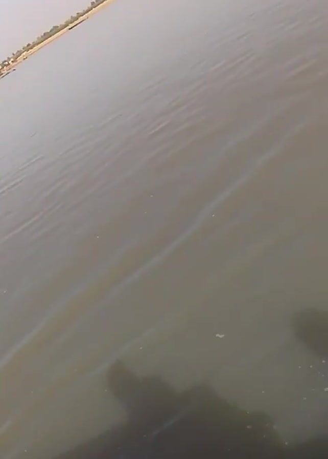 The camera moves across a wide, still body of water, likely a river, under a clear sky. The water is a murky gray-brown color with subtle ripples. In the distance, there's a low-lying landmass, potentially a riverbank or island, with a sparse tree line. Closer to the camera, a row of large, cylindrical metal structures emerges from the water. These appear to be supports for a bridge under construction. Some of the supports have what looks like construction materials or debris attached to them. The camera seems to be moving on a boat, as indicated by the wooden edge of the vessel visible at the bottom of the frame.
